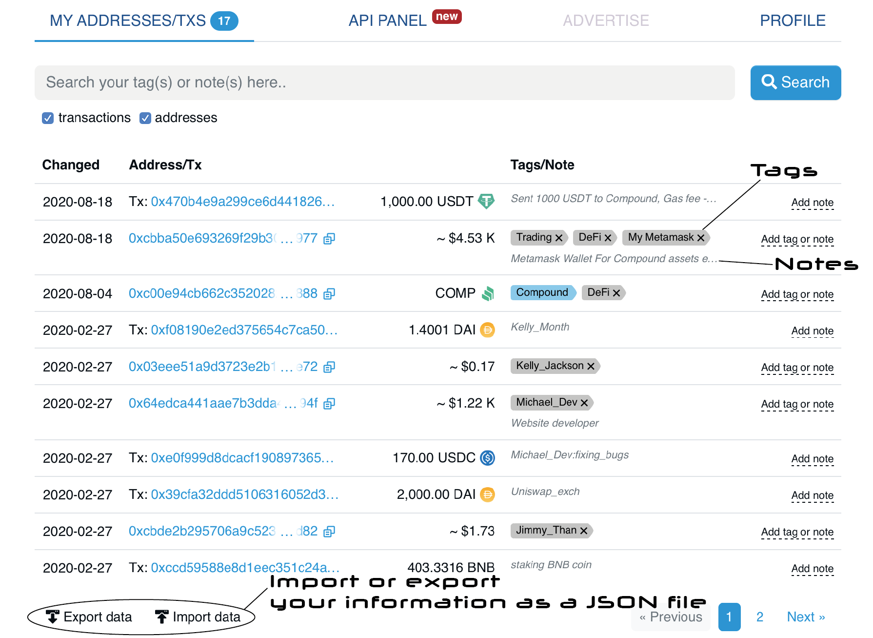 - Export the transaction history of any address (yours or others’) tags/ notes as a CSV file.