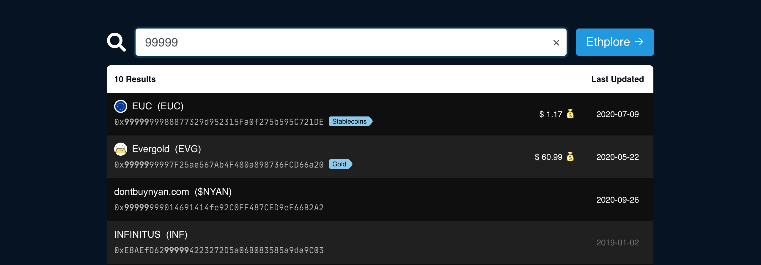 Want to hear about another nifty (or should we say nerdy) use of the feature? The Ethplorer search lets you look up addresses or tokens with particular numbers in them. For example, you can look up addresses that start with, or include, nines and zeros.